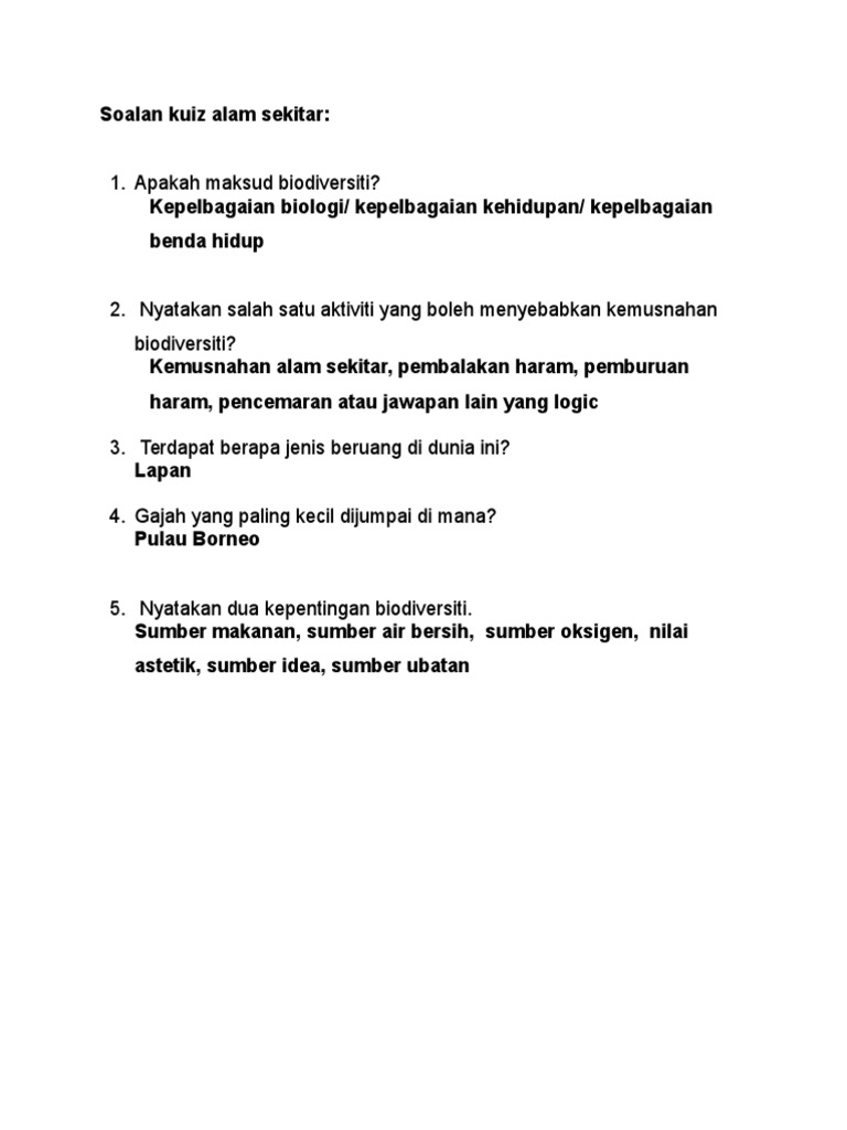 Setiap tahun pada tarikh tersebut seluruh dunia meraikan hari alam sekitar bermatlamat untuk mempertingkatkan tahap kesedaran masyarakat dunia terhadap isu alam sekitar serta mempertingkatkan tindakan dan. Soalan tentang Alam Sekitar Apakah kebaikan pokok terhadap benda hidup. Apakah kesan-kesan pembalakan secara haram.